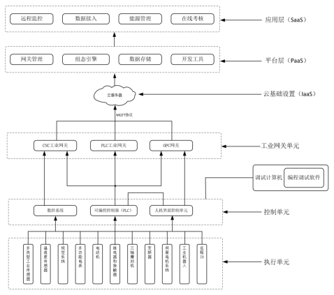 如圖1所示,基于工業互聯網架構原理搭建了一套典型的工業互聯網架構,自下而上分別是執行單元、控制單元、工業網關單元、云基礎設置、平臺層和應用層,每一層相對獨立,又層層關聯,每一層的連接關系如下:
