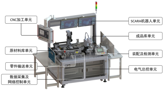 實訓系統主要由原料庫單元、CNC加工單元、零件輸送單元、SCARA 機器人單元、裝配及檢測單元、成品庫單元、系統氣源及電氣總控單元、數據采集及網絡控制單元、工業云平臺等組成,如圖2所示。