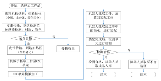 裝配完成后,檢測機構進行裝配檢測,檢測合格的工件由SCARA機器人搬運至成品庫單元,檢測不合格的工件搬運至不合格產品收集工位。