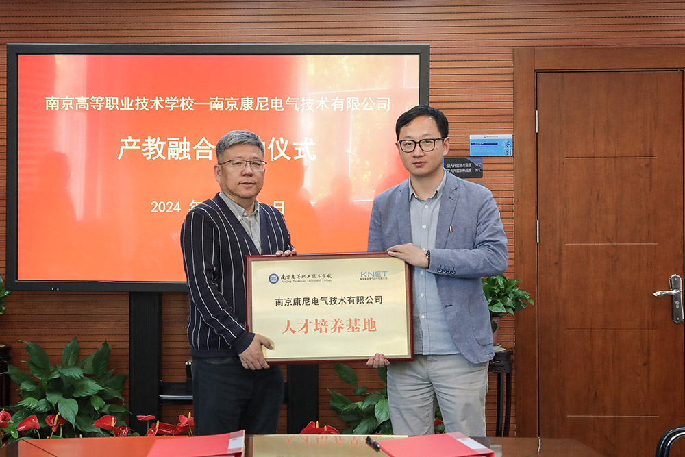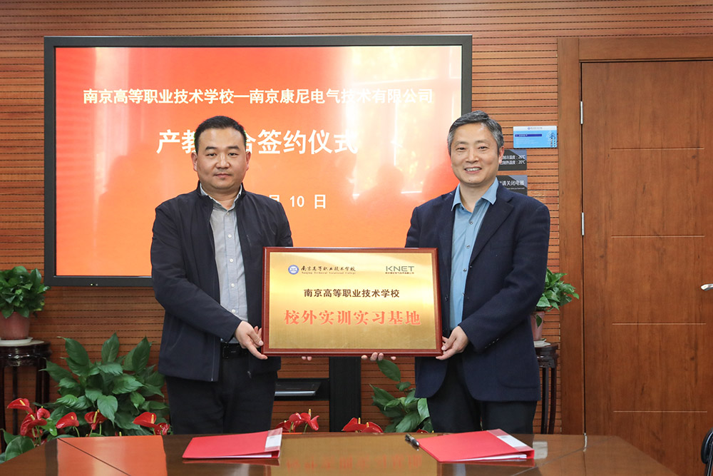 康尼電氣市場部部長李向陽向南京高職校電氣工程系主任張華軍授予校外實訓實習基地銅牌。